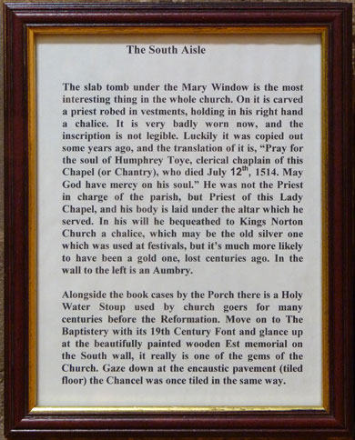 Hidden behind the altar in the south aisle of St Nicolas', beneath the window of the Virgin and Child, in the former chantry chapel of the Blessed Virgin Mary, there is what appears to be a gravestone set into the floor. It is badly worn now, but we know, from a sketch made in 1826 by the antiquary Dr Peter Prattinton, that it commemorates Humphrey Toye, a chantry priest of Kings Norton, who died in 1514.